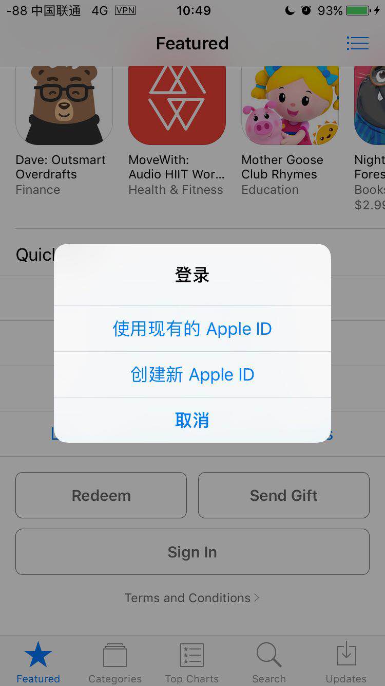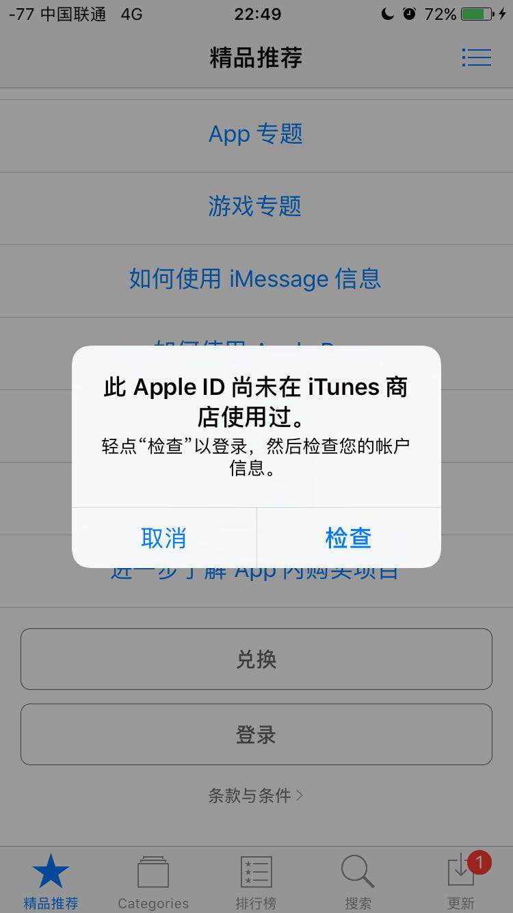 打开App Store 登陆刚刚注册成功的 Apple ID 时会显示一下页面,点击