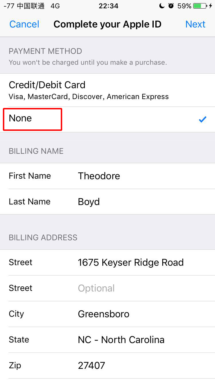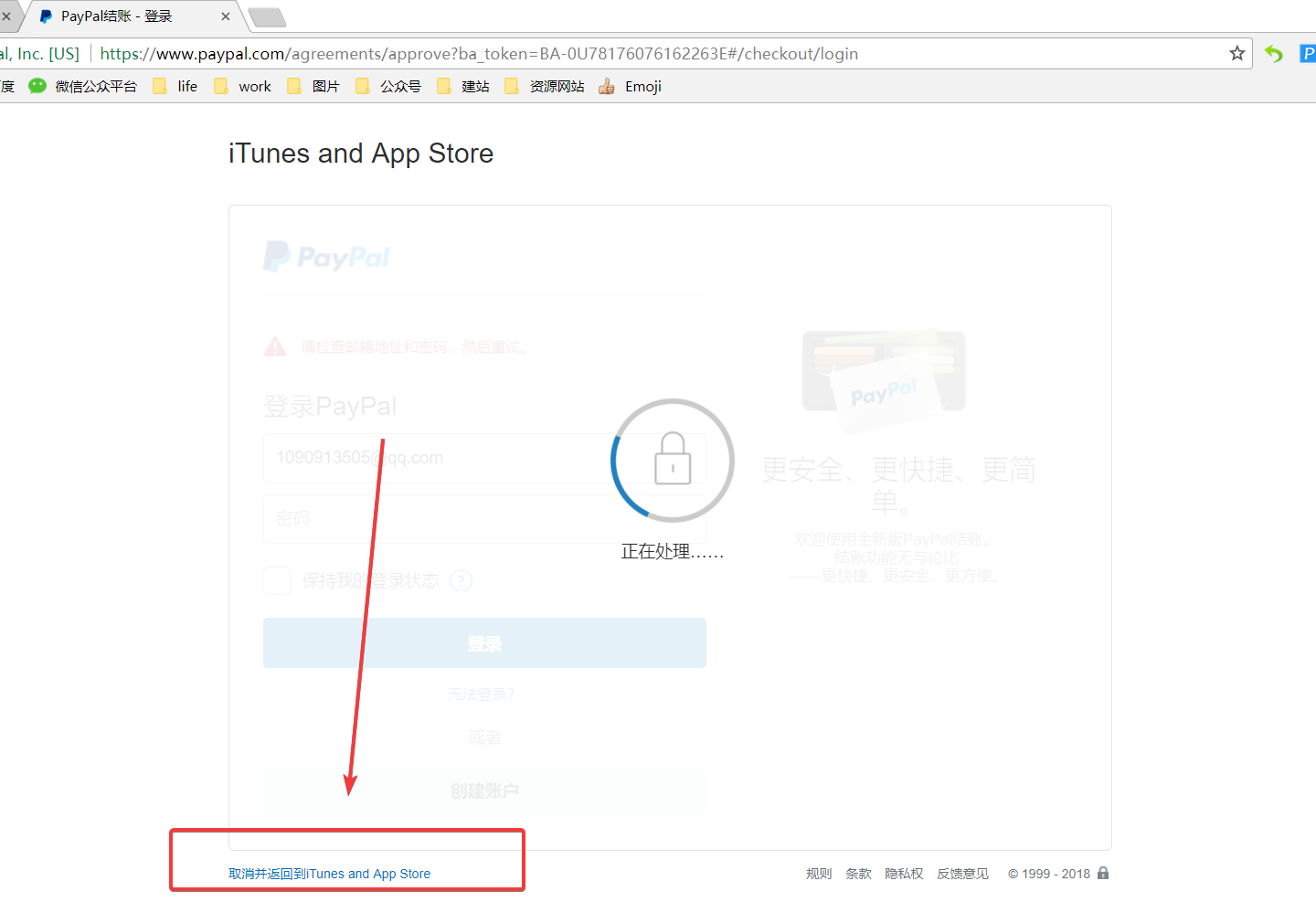 取消并返回到iTunes and App Store第一次可能不会出现None选项,需要刷新两三次PayPal的网页,再点击取消并返回到iTunes and App Store。(我刷新了两次就出现了None选项)