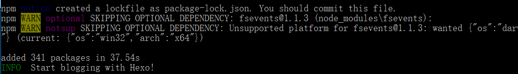 最后显示 Start blogging with Hexo! 说明安装成功