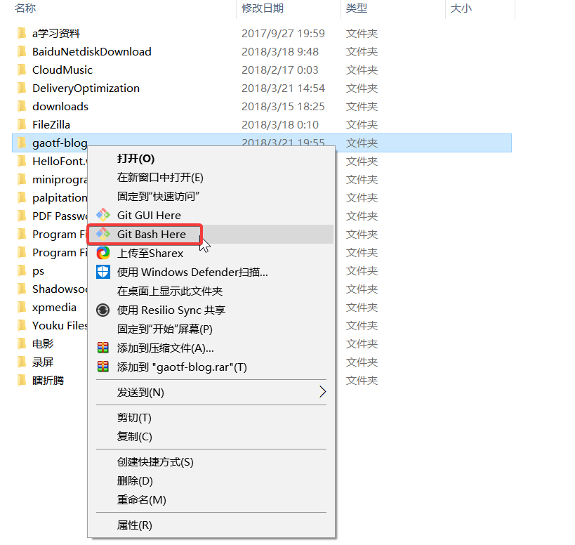 找到文件夹yourblog我的是在gaotf-blog,右键 Git Bash Here