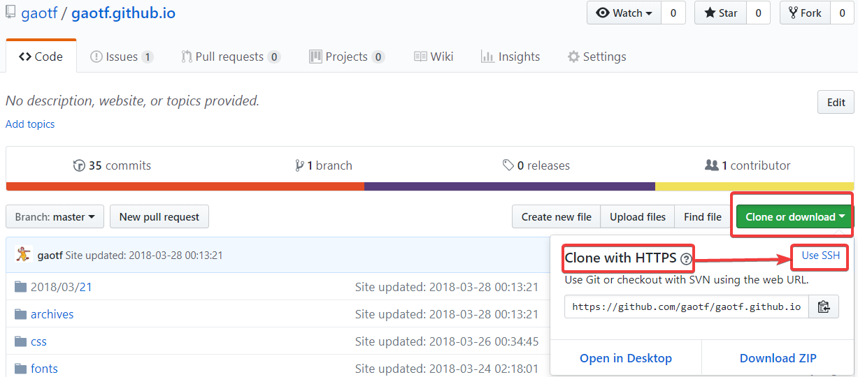 登陆GitHub,打开之前创建的储存库,点击右上角 Clone or download